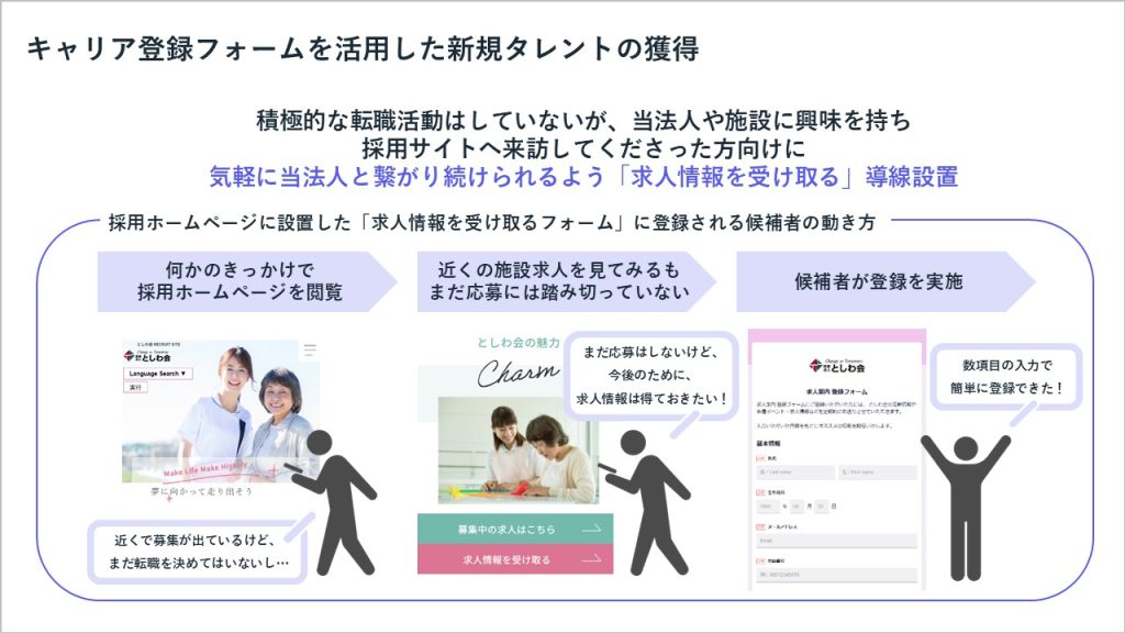 施策をスタートする初期段階においては、まず「キャリア登録フォーム」の設置が非常に有効だと感じています。応募のハードルを下げ、気軽に情報登録していただける導線を用意することで、中長期的な成果を見込んでいた取り組みが、結果として短期的な採用成果にもつながるケースがありました。接点づくりの入り口として、まずはこの仕組みを整えることが重要だと思います。