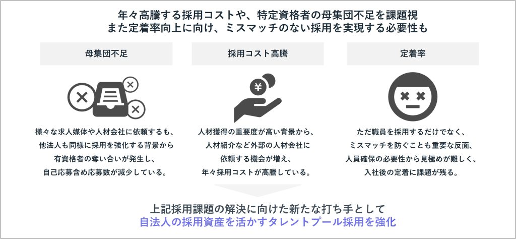 こうした採用課題に対し、当法人では新たな取り組みとして、自法人でこれまでに蓄積してきた採用資産を活用する「タレントプール採用」の強化に踏み出しました。