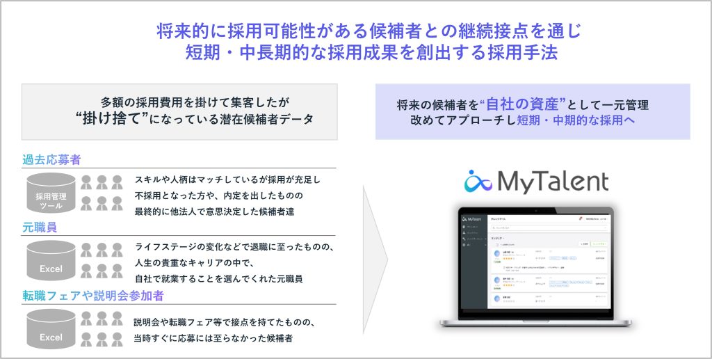 これらの方々に共通するのは、「タイミングが異なれば、採用に至っていた可能性がある」という点です。当法人では、こうした接点を掛け捨てにせず、自社の採用資産としてMyTalent上で一元管理し、適切なタイミングで再アプローチを行い、短期的・中長期的に採用に繋げています。