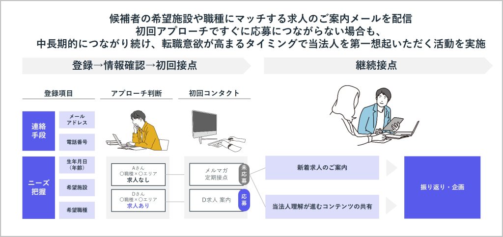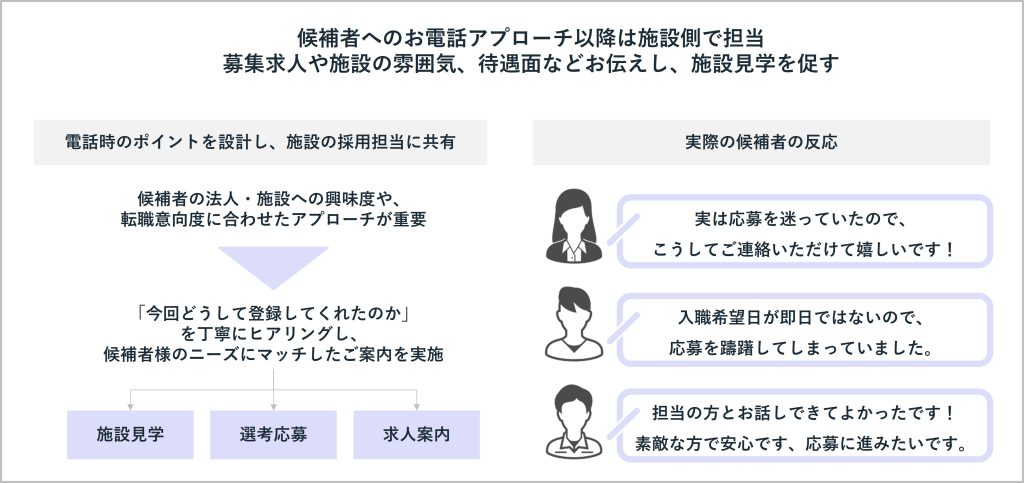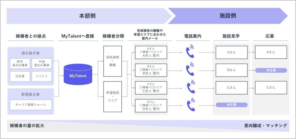 具体的には、候補者を保有資格・職種・希望施設・エリアなどの観点で分類し、それぞれに適した内容の案内メールなどをお送りすることで意向の醸成を図ります。応募の意欲が高まった段階で、お電話でのご案内や施設見学につなげ、最終的な応募に至るという仕組みです。対応範囲については、本部と施設で役割を分担しています。