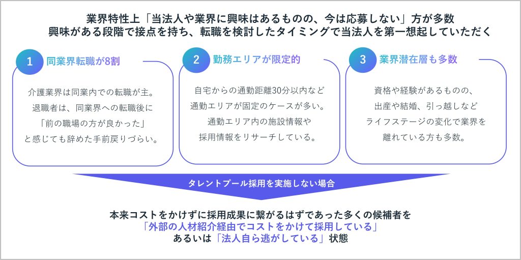 介護業界の特性上、「興味はあるが今すぐの応募には至らない」という方が多数である中で、興味がある段階で接点を持ち、転職を検討したタイミングで当法人を第一想起いただく状態を作ることが重要だと考えています。「なぜ興味があるのか?」また、「なぜ今すぐの応募に至らないのか」については、以下3点がポイントだと思っています。