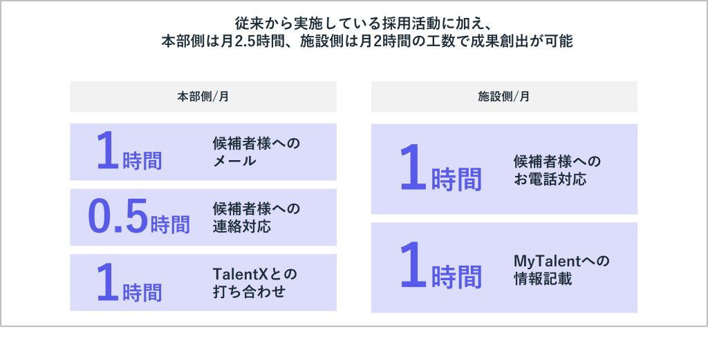 本部での対応としては、登録のあった候補者へのメール送信や返信対応、および電話対応などを含めても、月間でおおよそ1.5時間程度の工数にとどまっています。また、メルマガ等の配信に関しては、TalentXのご担当者と打ち合わせを行いながら進めており、この打ち合わせ時間も月に1時間程度です。さまざまな施策についてご提案・実行いただけるため、非常に助かっています。また、施設側での対応も、候補者への電話連絡および対応に約1時間、経過記録の記載に約1時間と、月合計で2時間程度に抑えられています。