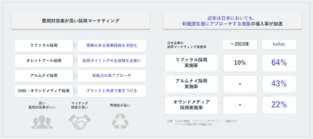 特に、費用対効果の高い取り組みとしてリファラル採用・タレントプール採用・アルムナイ採用、さらにSNSやオウンドメディアを活用した採用が注目されています。近年は、転職潜在層に向けた施策の導入も加速しており、日本における採用も“本当に欲しい人材を戦略的に獲得する時代”へと変化しつつあるのです。