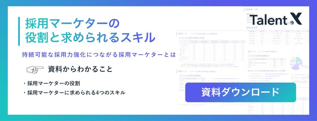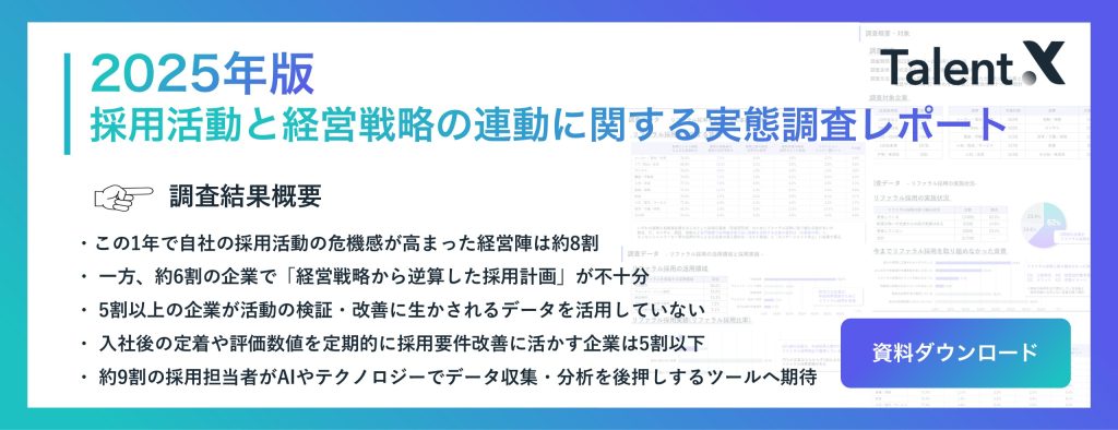 この記事は株式会社TalentXが運営するTalentX Lab.の編集部が監修しています。TalentX Lab.は株式会社TalentXが運営するタレントアクイジションを科学するメディアです。自社の採用戦略を設計し、転職潜在層から応募獲得、魅力付け、入社後活躍につなげるためのタレントアクイジション事例やノウハウを発信しています。記事内容にご質問などがございましたら、こちらよりご連絡ください。