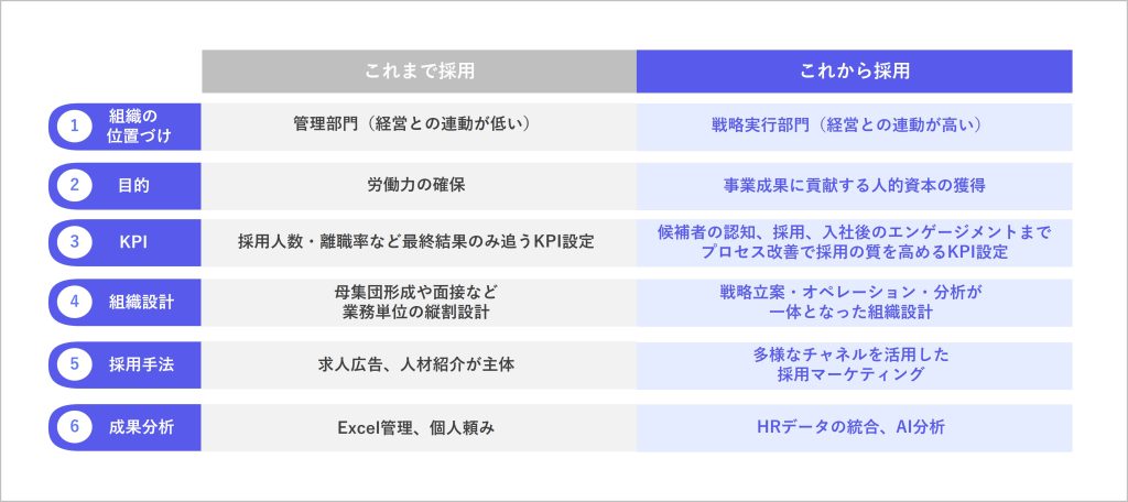 たとえば、これまでは「労働力の確保」を目的とした採用が中心でしたが、今後は 事業成長に寄与する人材をいかに獲得し、戦略的に配置できるかが重視されるようになります。採用KPIの考え方や体制設計、データ活用の範囲など、採用の在り方そのものが転換期を迎えているとも言えます。