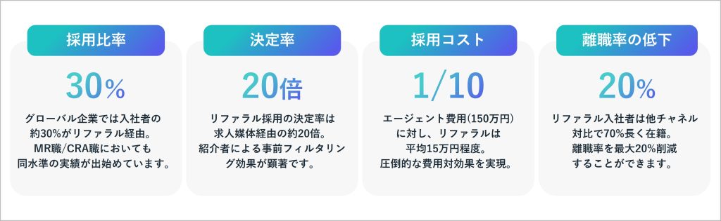 これらの要因が重なり合うことで、MR職/CRA職の採用は、「募集をかければ人が集まる」フェーズから、「適切な候補者と接点を持てるか」が問われるフェーズへと移行しています。こうした環境下では、業界理解や職務理解を備えた人材と出会うために、社員のつながりを起点としたリファラル採用の重要性が高まっていると言えるでしょう。