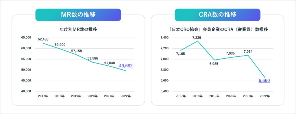 MR(Medical Representative)およびCRA(Clinical Research Associate)は、いずれも業界全体で人材数が減少傾向にあります。MR認定センターの調査によると、MR数は2017年の約6.2万人から2022年には約4.9万人まで減少しています。また、CRAについても同様の傾向が見られ、JCROA(日本CRO協会)の公開データでは、会員各社に在籍するCRA数が2017年の7,165人から2022年には6,600人へと減少しています。