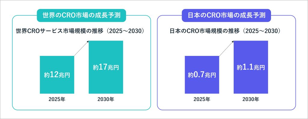 日本国内においても同様の傾向が見られ、2025年時点で約0.7兆円規模だったCRO市場は、2030年には約1.1兆円へと拡大する見通しです。