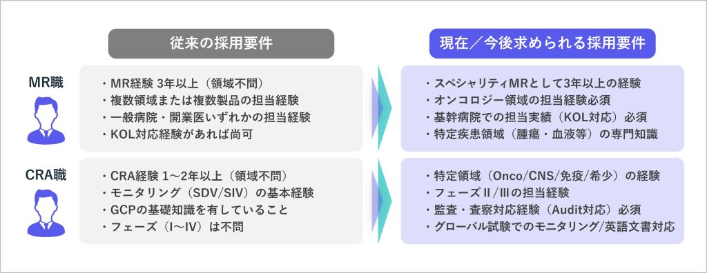 MR職においては、オンコロジーをはじめとした特定領域の担当経験や、基幹病院でのKOL(Key Opinion Leader)対応経験が必須条件となるケースが増え、スペシャリティMRとしての深い疾患知識が求められるようになっています。一方、CRA職においても、特定領域での治験経験やフェーズⅡ/Ⅲの担当実績、監査・査察対応、さらにはグローバル試験における英語文書対応など、より高度なスキル・経験が重視される傾向にあります。