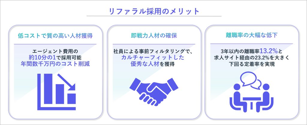 リファラル採用は、低コストかつ高い成果が期待できる採用手法として注目されています。エージェント経由の採用と比較して、約10分の1のコストで採用できるケースもあり、年間で数千万円規模のコスト削減につながった事例もあります。また、社員による事前のフィルタリングが働くことで、業務内容やカルチャーへの理解度が高い即戦力人材を獲得しやすい点も特徴です。その結果、入社後のミスマッチが起こりにくく、3年以内の離職率は13.2%と、求人サイト経由(23.2%)を大きく下回る定着率を実現しています。すでにリファラル採用に取り組んでいる企業も多いと思われますが、その仕組みを適切に設計・運用することで、採用コストの削減と定着率の向上という、従来の採用活動で課題とされてきた点を同時に解決することが可能です。