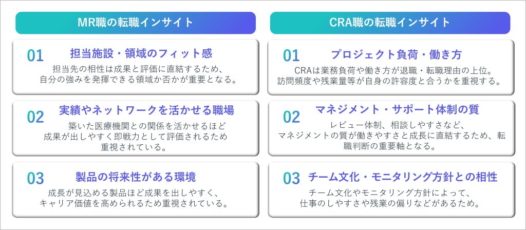 MR職/CRA職ともに、転職時に重視されるのは「自分の強みが活かせる環境か」「働き方や業務負荷が実態と合っているか」「チーム文化やマネジメントの質はどうか」といった、働く現場のリアルな情報です。特にMR職では、担当施設や担当領域との相性、製品の将来性が重要な判断軸となります。一方、CRA職では、プロジェクト体制や訪問頻度、サポート体制の質などが、転職後の働きやすさやキャリア形成に直結します。これらはいずれも、求人票だけでは把握しづらく、意思決定に大きな影響を与える要素です。