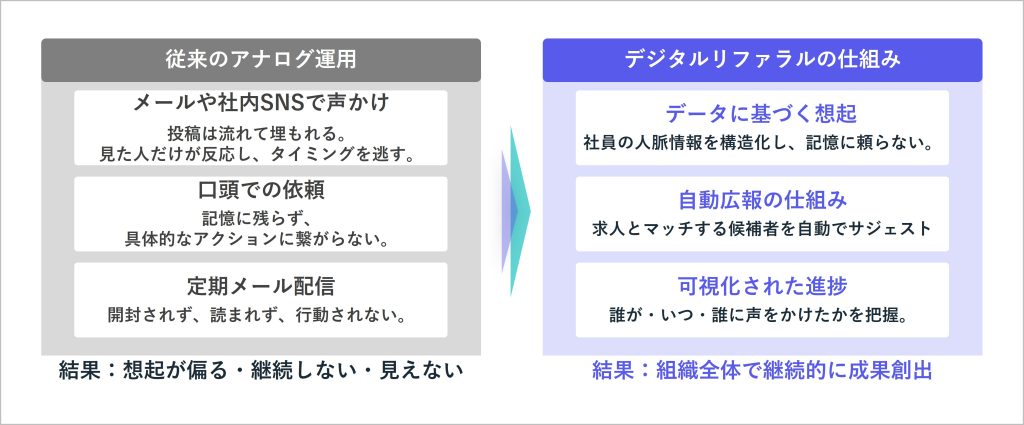これまでリファラル採用は、メールや社内SNSでの声かけ、口頭での依頼など、属人的かつアナログな手法に依存してきました。しかしこの方法では、情報が流れて埋もれてしまい、社員の一部しか反応せず、想起や行動が継続しないという限界があります。