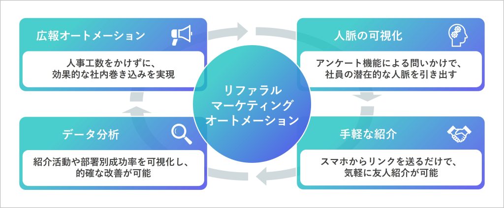 リファラル採用を社内に根づかせ、紹介が継続的に生まれる状態をつくるには、特定の社員に依存せず、多くの社員が参加しやすい仕組みが不可欠です。デジタルの仕組みを取り入れることで、社内広報の最適化・自動化が可能となり、社員一人ひとりが持つ潜在的な人脈を引き出し、これまで見えていなかった候補者を発掘できるようになります。