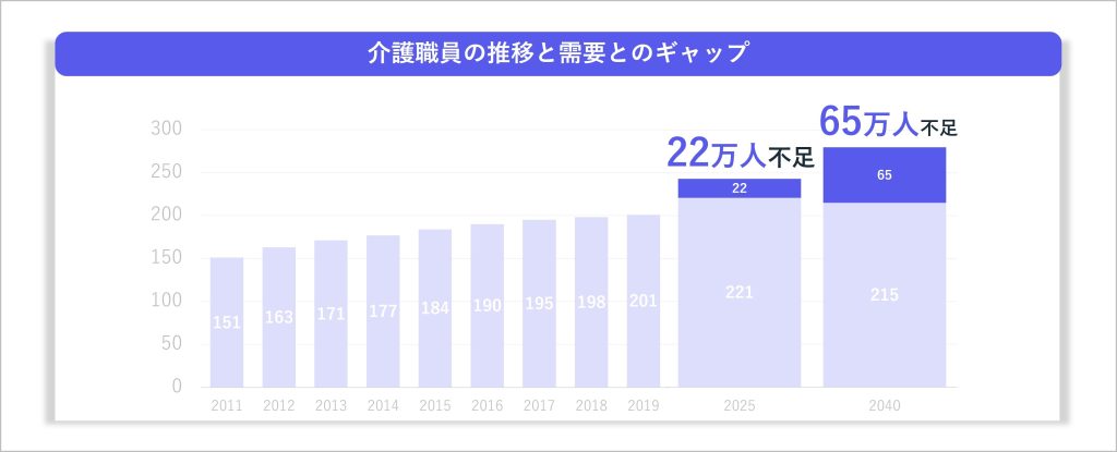 介護・病院業界では、高齢化の進行によりサービス需要が今後も拡大していく一方で、人材の確保が追いついていない状況が続いています。2040年には介護職員が大幅に不足すると見込まれており、人材確保は業界全体に共通する重要なテーマとなっています。