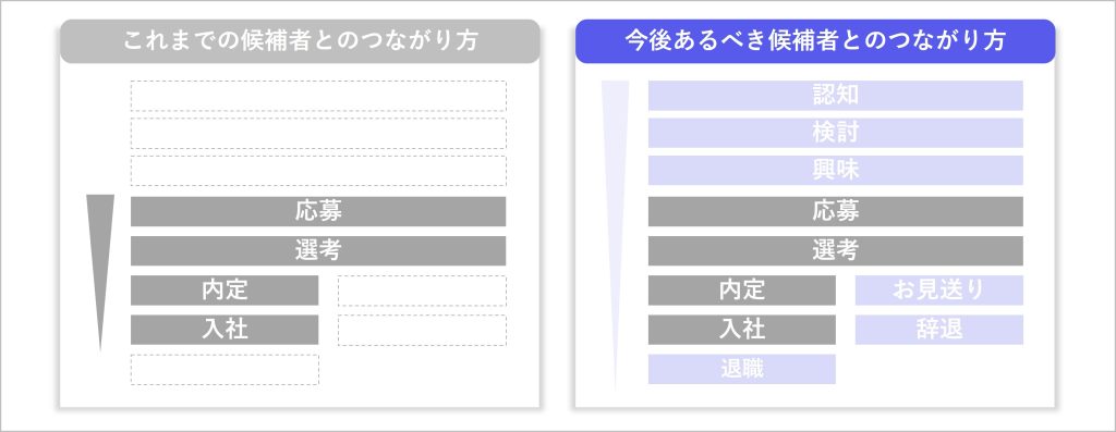 これまでの採用では、「応募→選考→内定→入社」という短期の流れの中で、辞退やお見送り、退職によって接点が途切れてしまいがちでした。これに対して今後は、認知・検討・興味の段階にいる候補者や、過去に接点があった候補者を「将来の応募者」として捉え、情報を自社の資産として蓄積し、適切なタイミングで想起・応募につなげていく考え方が求められます。