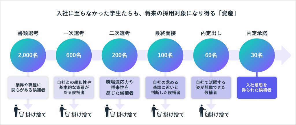 新卒採用では、企業は毎年多くの学生と接点を持っています。ナビ媒体経由のエントリーや選考を通じて、業界や職種に関心を持ち、自社の基準を一定程度満たした候補者と数多く出会っていますが、実際に入社に至るのはその中のごく一部に限られます。