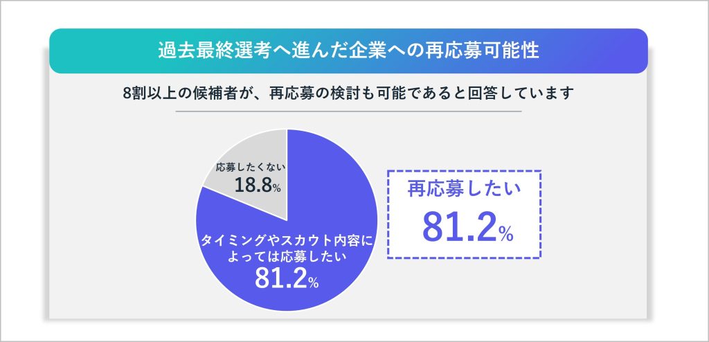 実際に、新卒採用で接点のあった学生は、過去に選考を受けた企業への再応募について、条件やタイミング次第で前向きに検討したいと考える傾向があります。また、新卒時に接点のあった候補者が、数年後に第二新卒として人材紹介会社から紹介されるケースも見られます。新卒時には入社に至らなかったとしても、その後のキャリアやライフステージの変化によって、再びマッチする可能性は十分に考えられるでしょう。