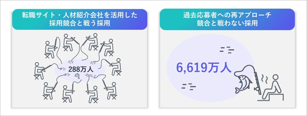 転職サイトや人材紹介会社を通じて競合他社と母集団を奪い合うのではなく、過去に接点のある候補者へ再アプローチすることで、競合と戦わない採用が可能になります。再アプローチ時の候補者と企業の関係性は、見ず知らずの状態ではなく、すでに一度選考を通じて相互理解が進んでいる関係です。そのため、企業からの声かけも受け取られやすく、応募意向が高まりやすいといえます。