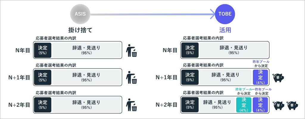 過去の応募者データを掛け捨てにせず蓄積・活用することで、毎年多額のコストをかけて新たな母集団形成を行う必要性が相対的に下がります。決定に至らなかった応募者データも、翌年や数年後の採用決定につながる可能性があり、結果として自社の採用力そのものを高めていくことができます。