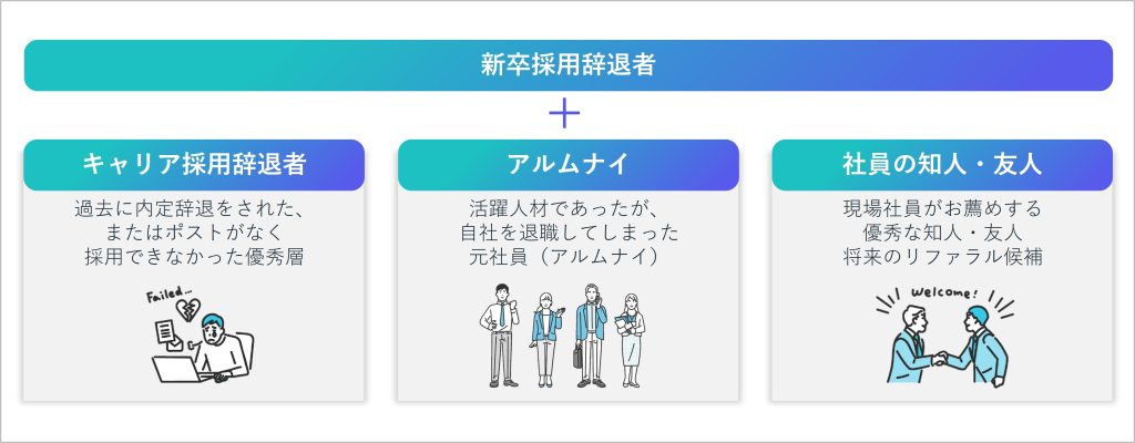 「新卒辞退者の活用」はタレントプール施策のひとつの入り口にすぎません。 実際には、企業がこれまで築いてきた様々な接点―たとえば、アルムナイやキャリア採用辞退者、社員の知人なども、”将来の採用候補”として活用できる重要な資産です。 これらの人材を統合的にプールし、戦略的に再接点を設計していくことが成功のカギとなります。