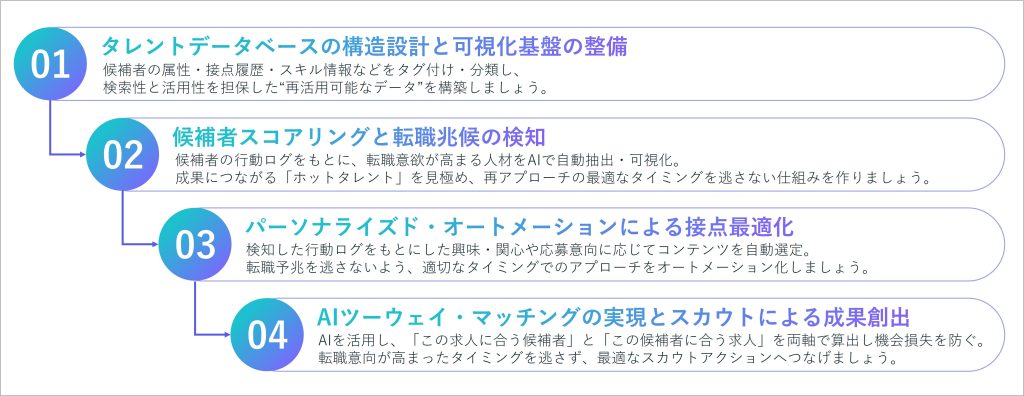 ここまで、タレントプール採用の有効性や実施ステップについてお伝えしてきました。一方で、候補者の意欲や行動の変化に応じて、最適なタイミングで、パーソナライズされたアプローチやスカウティングを、属人的な運用だけで実現し続けることは容易ではありません。