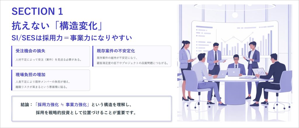 このような構造を踏まえると、SI/SES採用では、採用を単なる欠員補充として捉えるのではなく、事業成長のための戦略的投資として位置づけることが重要です。