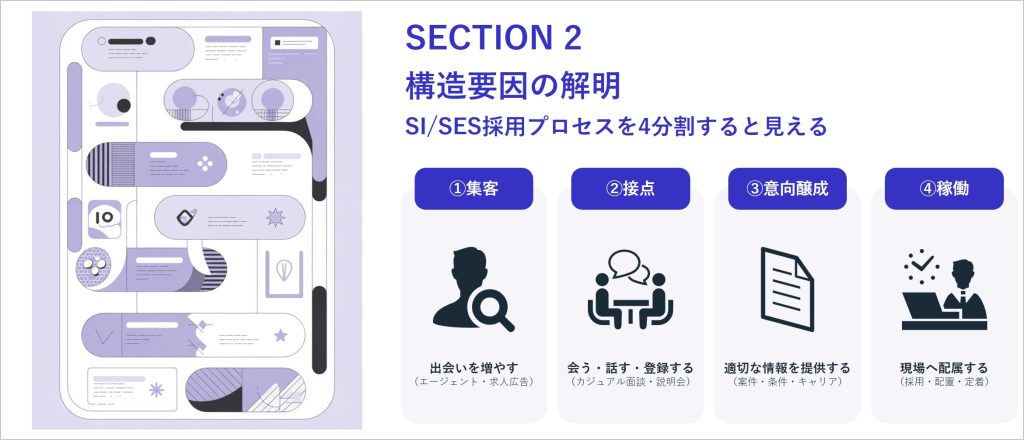 SI/SESにおけるエンジニア採用は、「集客」「接点」「意向醸成」「稼働」という4つの工程で成り立っています。求人広告やエージェント、スカウトなどによる集客に力を入れている企業は多いものの、その後の工程が十分に設計されていないケースも少なくありません。