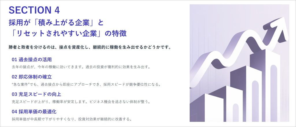 一方で、採用成果を積み上げている企業は、既存の候補者接点を資産として管理し、候補者の関心や状況の変化を把握しています。案件発生や不満が高まったタイミングで再アプローチできる設計を持つことで、毎年ゼロからやり直す採用から脱却しています。