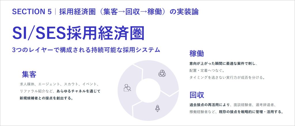 SI/SES採用を「集客」「回収」「稼働」という一連の流れとして捉えることで、採用活動は単発施策ではなく、継続的に成果を生む仕組みになります。