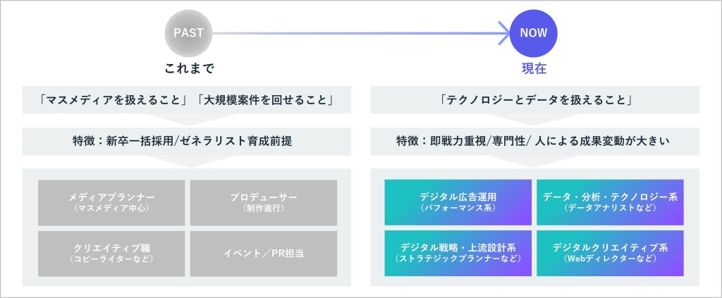 こうした変化に伴い、広告会社が求める人材像も大きく変わりつつあります。新卒一括採用を前提に時間をかけて育成するモデルから、専門性を即座に事業成果へと転換できる即戦力人材の確保へとシフトが進んでいます。デジタル広告運用、データアナリスト、ストラテジックプランナー、デジタルクリエイティブなど、専門領域に特化した職種の重要性が高まっている点が、現在の広告業界の特徴といえます。