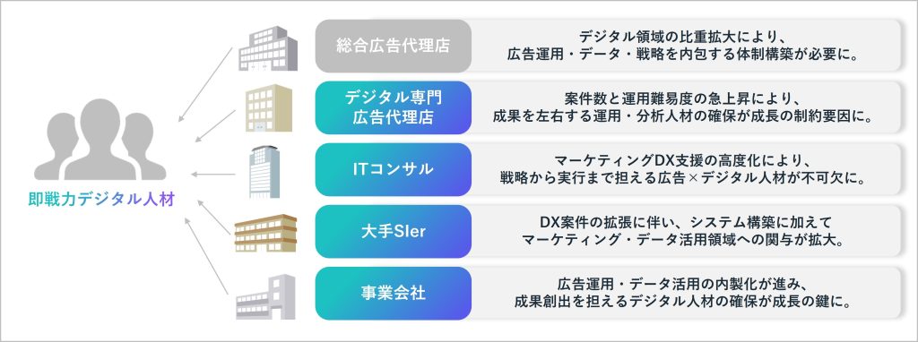 デジタル領域の重要性が高まる中で、「広告×デジタル人材」を巡る獲得競争は、広告業界内にとどまらず、業界横断的に激化しています。ITコンサルティングファームやSIer、事業会社なども同様の人材を求めており、同じスキルセットを持つ人材が複数の業界から同時に狙われる構造が生まれています。
