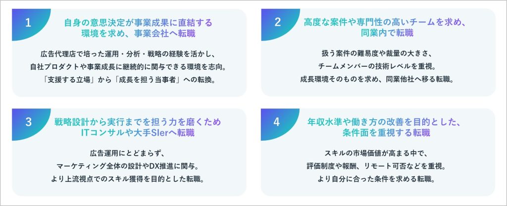 獲得競争が激化する一方で、「広告×デジタル人材」側の転職行動にも変化が見られます。専門性の高い人材ほど、単一の条件ではなく、複数の観点を組み合わせて転職先を選択する傾向があります。
