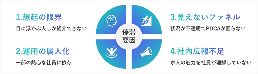 一方で、リファラル採用を導入しても、継続的な成果につながらないケースも少なくありません。その背景には、制度設計や運用面における構造的な課題が存在します。