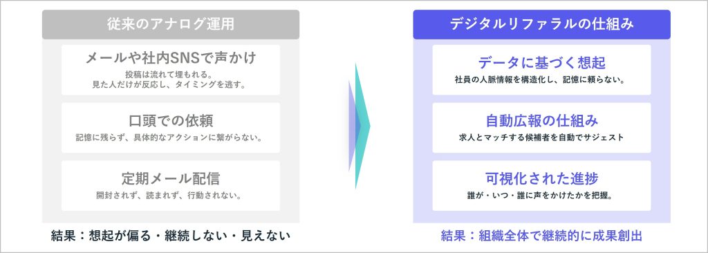 従来のリファラル採用は、メールや社内SNSでの告知、口頭での依頼など、アナログな手法に依存してきました。しかし、情報は流れて埋もれやすく、紹介行動が継続しにくいという限界があります。