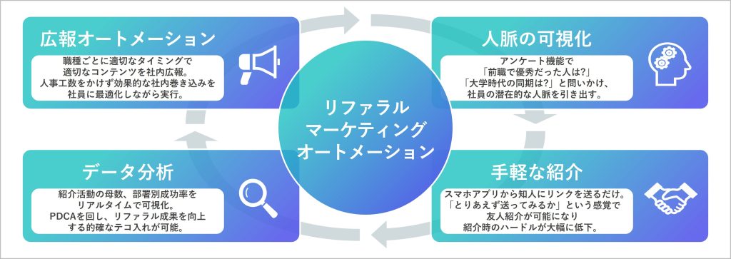 リファラル採用を継続的に機能させるためには、個人の努力に依存しない仕組みづくりが重要です。デジタルツールを活用することで、社内広報の自動化や人脈の可視化、進捗管理が可能になります。社員のライフサイクルに合わせた情報提供や動機づけにより、自然な形でリファラル文化を浸透させることができます。その結果、人事は手運用から解放され、戦略的な採用施策にリソースを集中できるようになります。リファラルを一過性の施策ではなく、企業の採用基盤として定着させることが可能になります。