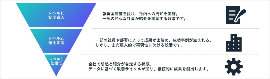 リファラル採用の取り組みは、成熟度によって大きく3つのフェーズに分けることができます。