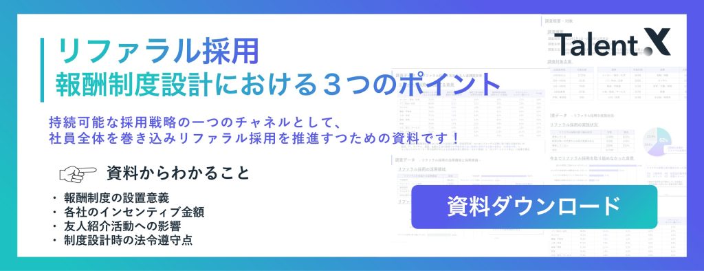 【リファラル採用制度や報酬制度設計におけるポイントはこちらの資料にまとめています】