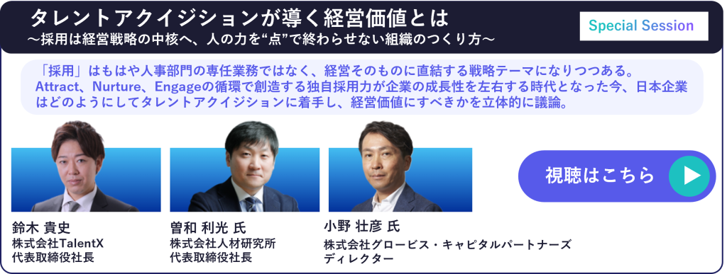 TalentXは2025年7月28日(月)、「タレントアクイジション」をテーマに据えた日本初*の大型イベント「Talent Acquisition Conference 2025」を開催しました。当日は350社を超える人事・経営者の皆さまにご参加いただき、「タレントアクイジション」という新しい採用の在り方がこれからの採用を変革する実践的なアプローチとして、多くの共感と熱量を集め、日本の採用マーケティングの未来を共に考える場となりました。